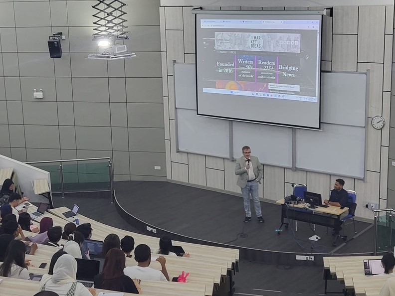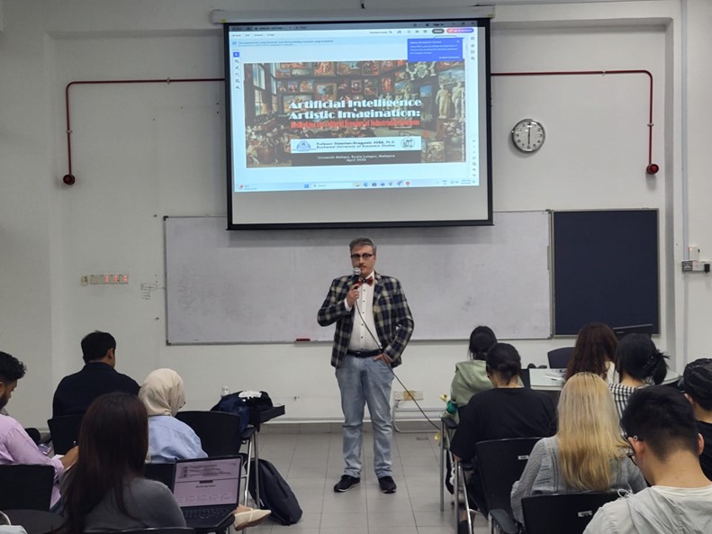 The visit of Professor Octavian-Dragomir Jora, Ph.D., under the Erasmus+ Staff Mobility for Teaching (STA) scheme, to Universiti Malaya (Kuala Lumpur, Malaysia, April 6-10), was conceived from the outset as an exercise meant to move beyond the constraints of mere comparability, highlighting instead the deeper scientific compatibility of the nowadays world. Beyond the inevitable need for mutual translation between distinct cultural and intellectual frameworks, what ultimately prevailed was a shared vein toward knowledge and critical inquiry – mediated by economics and empathy. In the lectures “Artificial Intelligence and Artistic Imagination: Rethinking the Cultural Economy of Industrial Revolutions” (Political Economy) and “The Market for Ideas amid Social Settings and Institutional Infrastructures: A Glimpse from Economics+” (Critical Thinking), layered meanings of the inescapable contemporary acronym “AI” – “artificial intelligence” and “artistic imagination”; “agoras of ideas” and “accelerated internationalization” – were revisited, across times and spaces, featuring as subtle junctions between technology and sensibility, as well as between sciences and consciences.
