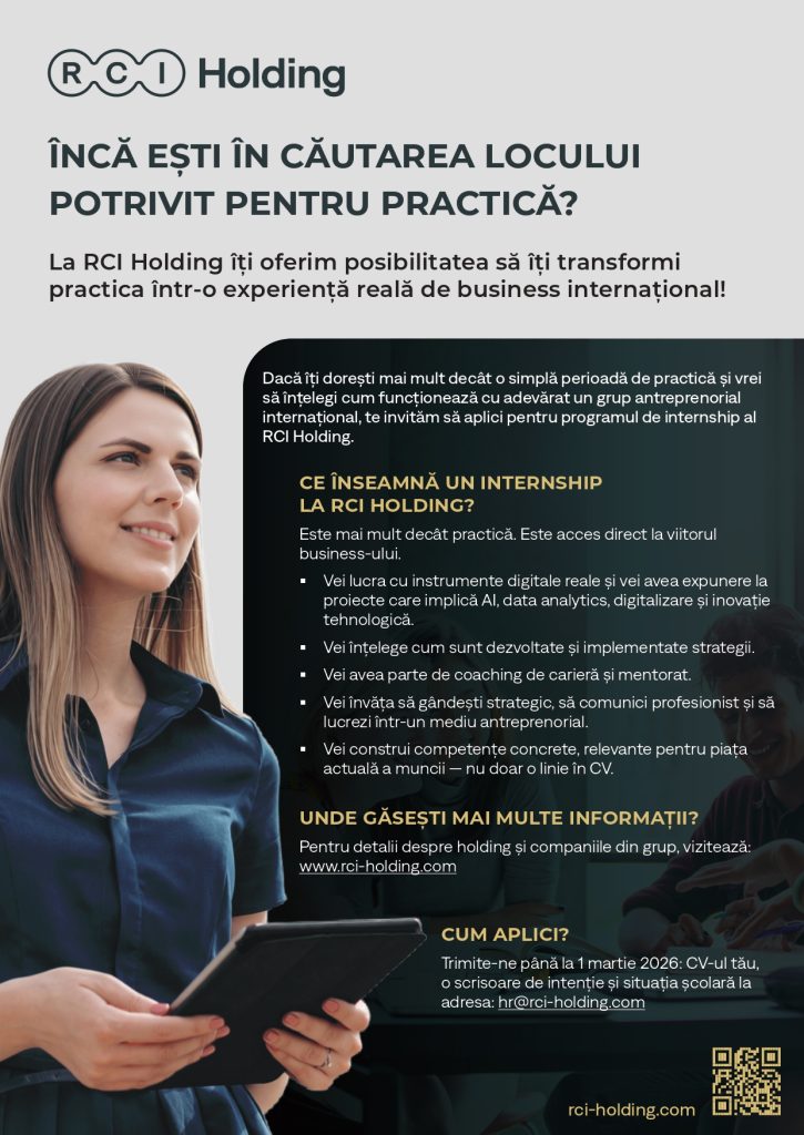 Mod de aplicare: trimiterea CV-ului, a unei scrisori de intenție și a situației școlare la adresa hr@rci-holding.com
